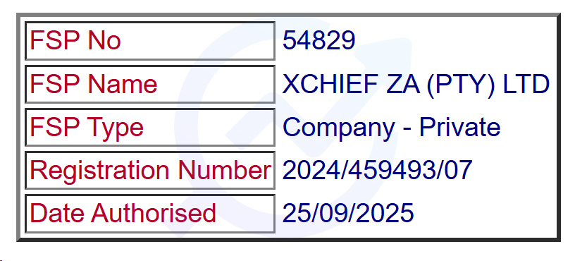 این کارگزار فارکس با نام XCHIEF ZA (PTY) LTD و به شماره 54829 تحت نظارت سازمان خدمات مالی آفریقای جنوبی (FSCA) فعالیت میکند.