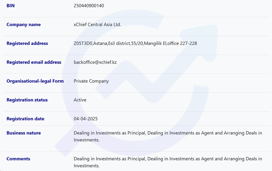 در انتها بروکر ایکس چیف موفق به دریافت مجوز فعالیت از اداره خدمات مالی آستانه – قزاقستان (AFSA) شده است. این مجوز به شماره 250440900140 و با نام xChief Central Asia Ltd قابل استعلام است. در ادامه استعلام این مجوز را مشاهده میکنید.