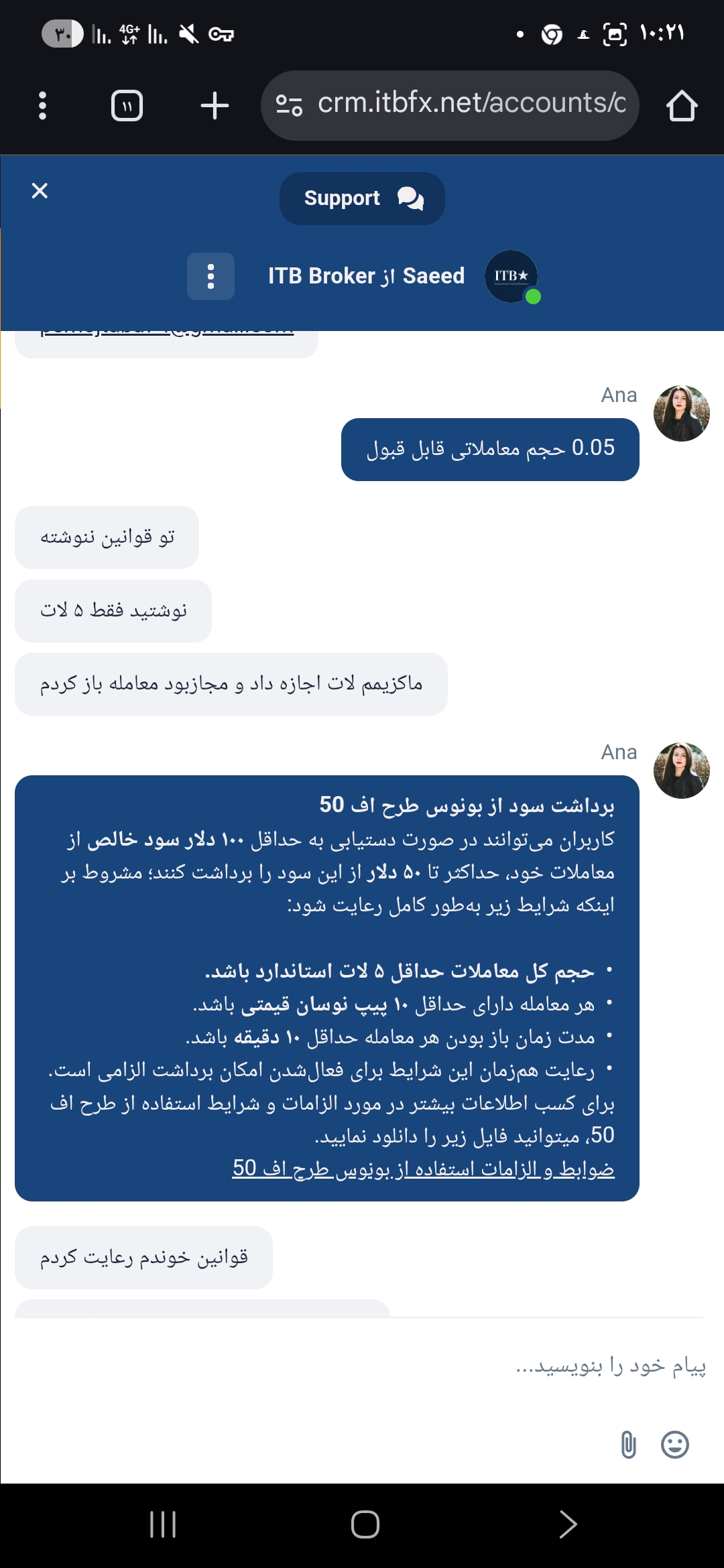 برای کسب اطلاعات دقیقتر، کارشناسان ایران بروکر با پشتیبانی آی تی بی اف ایکس ارتباط گرفته و ارائه خدمات این بروکر فارکس برای ایرانیان را استعلام کردند. مطابق تصویر زیر، پشتیبانی ITBFX نیز ارائه خدمات به ایرانیان را تأیید کرد.