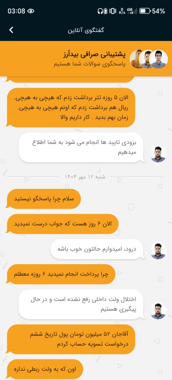 طبق گفتگوی که با پشتیبان صرافی بیدارز داشتیم، پشتیبان این صرافی در مهر 1404 اعلام کرد که برداشت رمزارز در این صرافی با اختلال مواجه شده و ممکن است برداشتها زمانبر باشد.