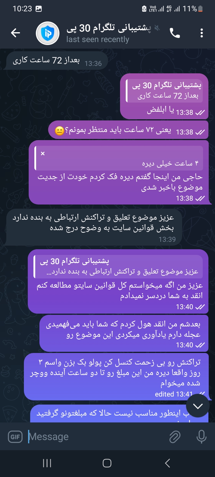 کارشناسان ایران بروکر، کیفیت پاسخگویی پشتیبانی ایران پرفکت را از طریق پیامرسان تلگرام ارزیابی کردند. تجربه این کارشناسان، حاکی از پاسخگویی سریع و مناسب پشتیبانی تلگرام 30 پی است.