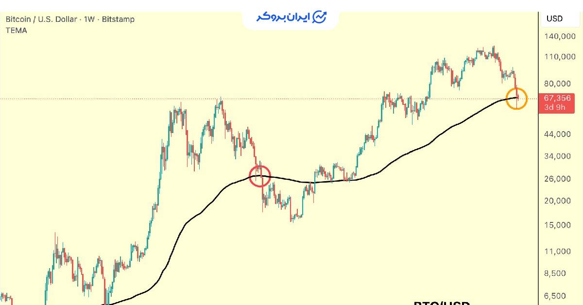 اکنون میانگین متحرک نمایی ۲۰۰ هفتهای که به اختصار EMA نامیده میشود، بهعنوان یک مقاومت جدید در کانون توجه قرار گرفته است. رکت کپیتال (Rekt Capital)، معاملهگر و تحلیلگر بازار، با مقایسه شرایط فعلی با بازارهای خرسی پیشین بیت کوین اعلام کرد بسته شدن هفتگی زیر این سطح و سپس بازآزمایی نزولی آن میتواند منجر به شتاب بیشتر در روند نزولی شود. به گفته او، سطح میانگین متحرک نمایی ۲۰۰ هفتهای در حال حاضر حدود ۶۸,۳۰۰ دلار است و از دست رفتن آن میتواند زمینه افتهای بیشتر را در گذر زمان فراهم کند.