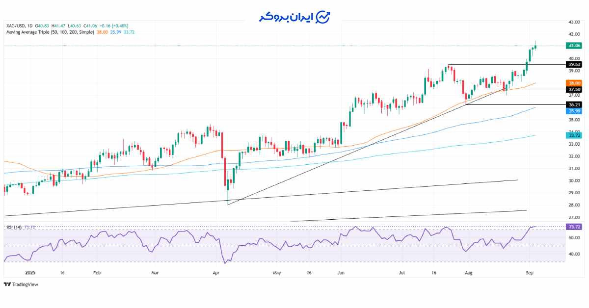از منظر تحلیل تکنیکال، رالی صعودی نقره پس از عبور از ۴۱ دلار، شتاب بیشتری گرفته است. اگرچه شاخص قدرت نسبی (RSI) در حال نزدیک شدن به محدوده «اشباع خرید» (Overbought) است، اما هنوز به سطح ۸۰ که به عنوان شرایط اشباع خرید شدید شناخته می‌شود، نرسیده است. این موضوع نشان می‌دهد که با وجود رشد سریع، ممکن است همچنان فضا برای صعود بیشتر وجود داشته باشد.