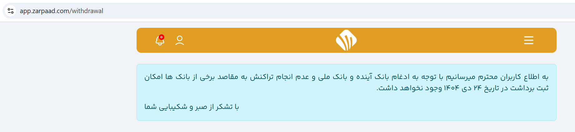 در روزهای اخیر کاربران زرپاد از اختلال در فرآیند برداشت وجه در این پلتفرم خبر دادهاند. پیگیریهای میدانی ایران بروکر از کانالهای رسمی و تماس مستقیم با تیم پشتیبانی زرپاد در تاریخ 6 بهمن نشان میدهد که در بازه زمانی فعلی، برداشت برای کاربران امکانپذیر نیست؛ این موضوع از سوی پشتیبانی زرپاد نیز در تماس تلفنی تأیید شده است.