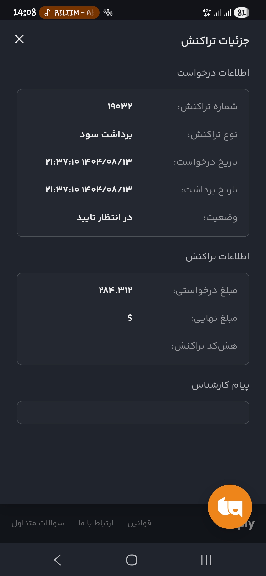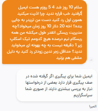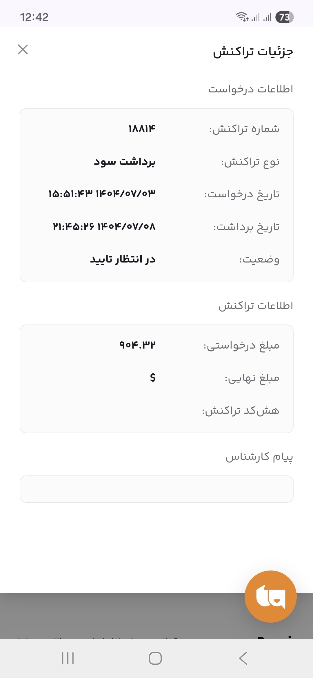 من دیروز برداشت سودم رو بعد از ۴۶ روز رد کردن. همون موقع تیکت زدم ولی هنوز جواب ندادن. با پشتیبانی آنلاین دارم صحبت میکنم، اصلا نمیزاره حرفم رو بزنم، چت رو می‌بنده. بعد که دوباره بهش پیام میدم دیدم بلاکم کرده . به هیچ عنوان ازشون حساب نگیرید. ۵ ماه وقت و انرژی گذاشتم آخر به من گفتن ربات. یعنی زحمت به خودشون ندادن یه یکم فکر کنم یه بهونه درست بیارن. قشنگ کلاهبردار شده.