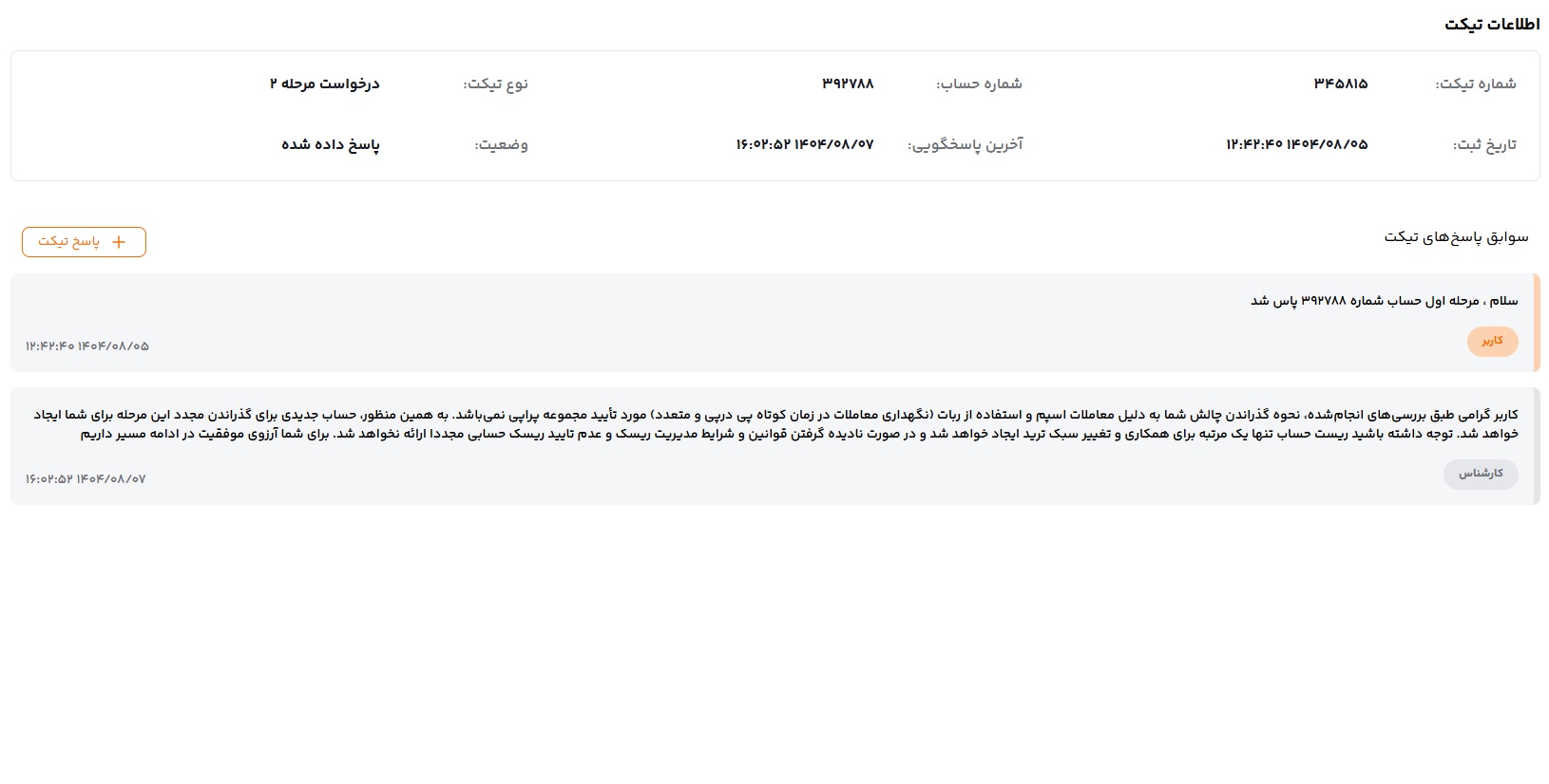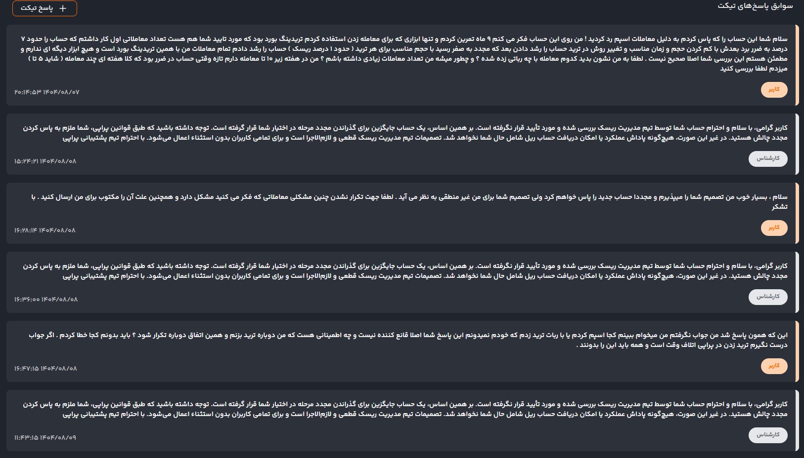 من الان یک هفته هستش هرچی تیکت میزنم و هر چی پیام به پشتیبانی میدم فقط گفتار درمانی میکنند از قبیل:« ما ارزش صبوری شما را می دانیم و توسط گروه مدیریت ریسک بررسی میشه و تعیین وضعیت خواهد شد و ....» فقط چند تا متن آماده دارند و برامون میفرستند