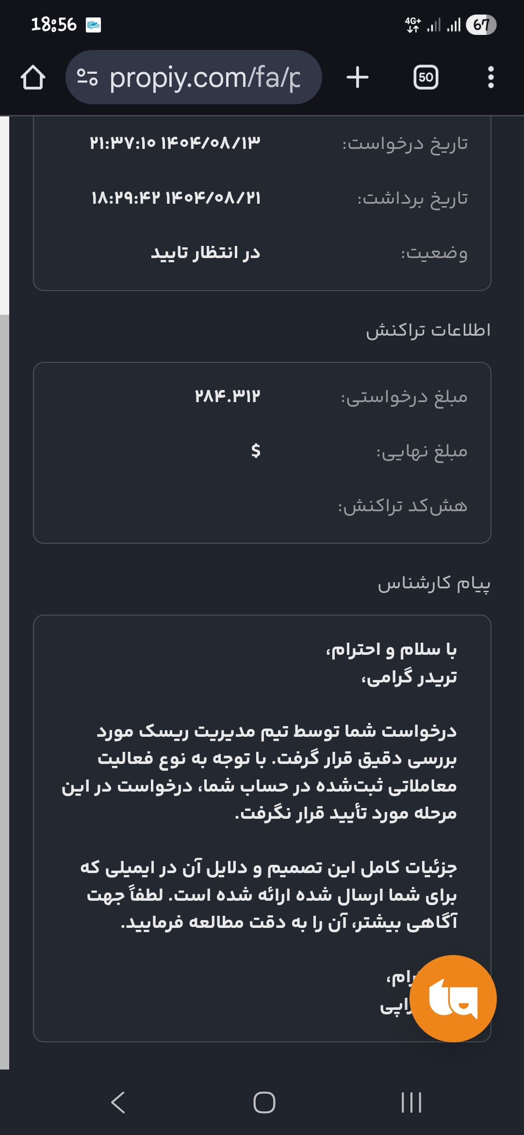 سلام دوستان عزیز من هم مثل خیلی از شما تونستم حسابم رو در پراپی پاس کنم والان بیش از 48 ساعته که درخواست برداشت سود دادم و درحال برسی توسط تیم مدیریت ریسکشون است نتیجه رو زیر همین نظر واستون می‌زارم با پشتیبانی شون هم حرف زدم که واستون می‌زارم